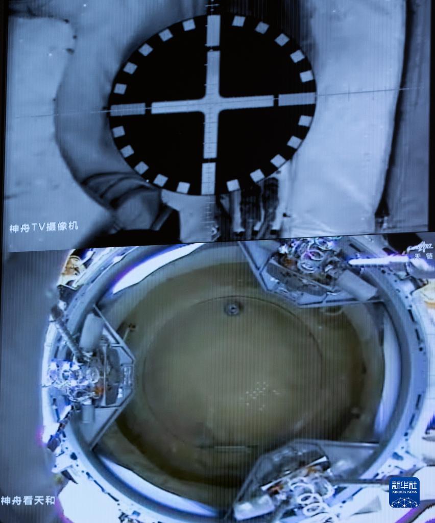 北京时间10月26日17时46分,神舟十七号载人飞船成功对接于空间站天和核心舱前向端口,由汤洪波、唐胜杰、江新林组成的“出差三人组”顺利进驻中国空间站,与神舟十六号航天员乘组汇合。后续,两个航天员乘组将在空间站进行在轨轮换。期间,6名航天员将共同在空间站工作生活约4天时间,完成各项既定工作。图为10月26日在北京航天飞行控制中心拍摄的神舟十七号载人飞船和空间站天和核心舱前向端口对接过程的画面。新华社