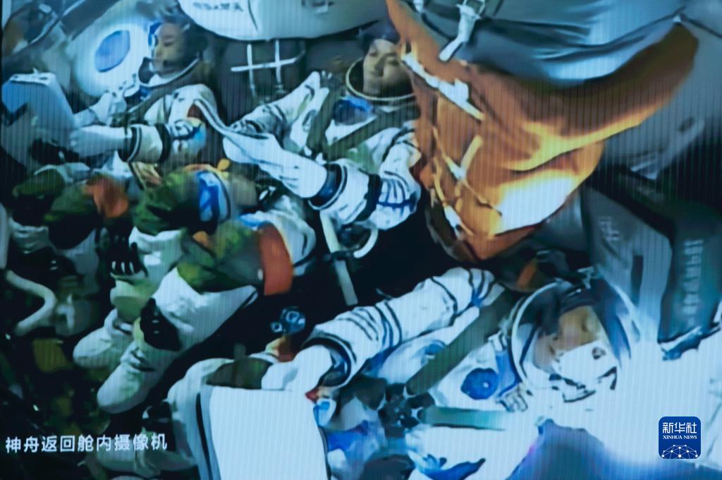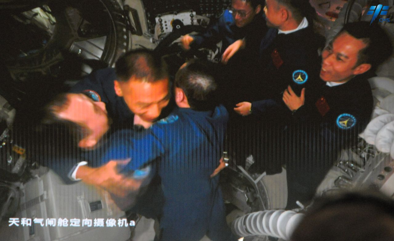 10月26日在北京航天飞行控制中心拍摄的神舟十六号航天员乘组欢迎神舟十七号航天员乘组的画面。大陆央视新闻客户端