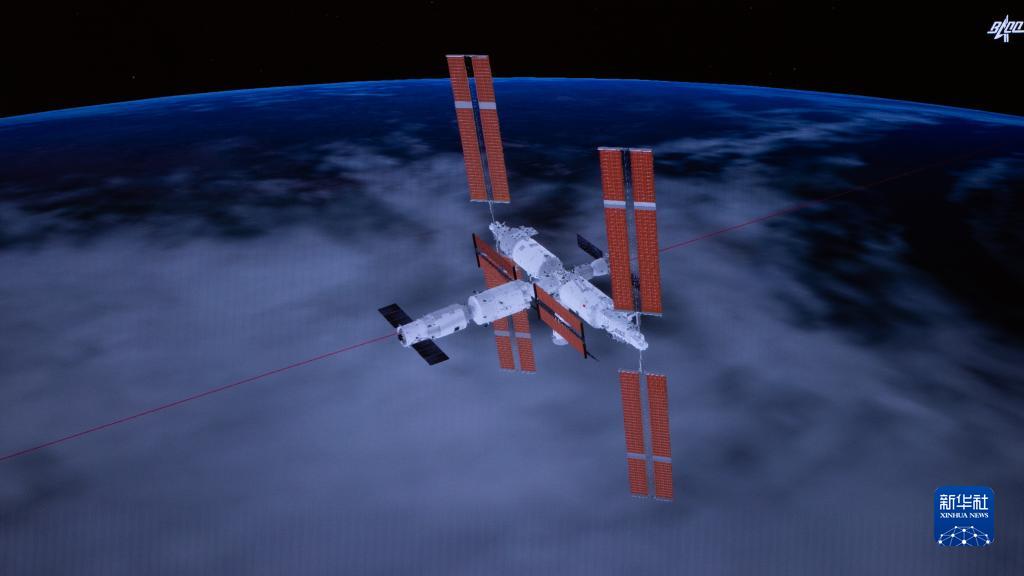 10月26日在北京航天飞行控制中心拍摄的神舟十七号载人飞船和空间站组合体的模拟画面。新华社