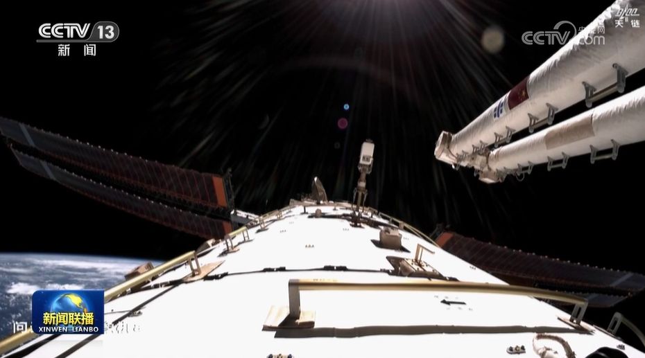 神舟十七号载人飞船与空间站天和核心舱对接画面。大陆央视新闻客户端