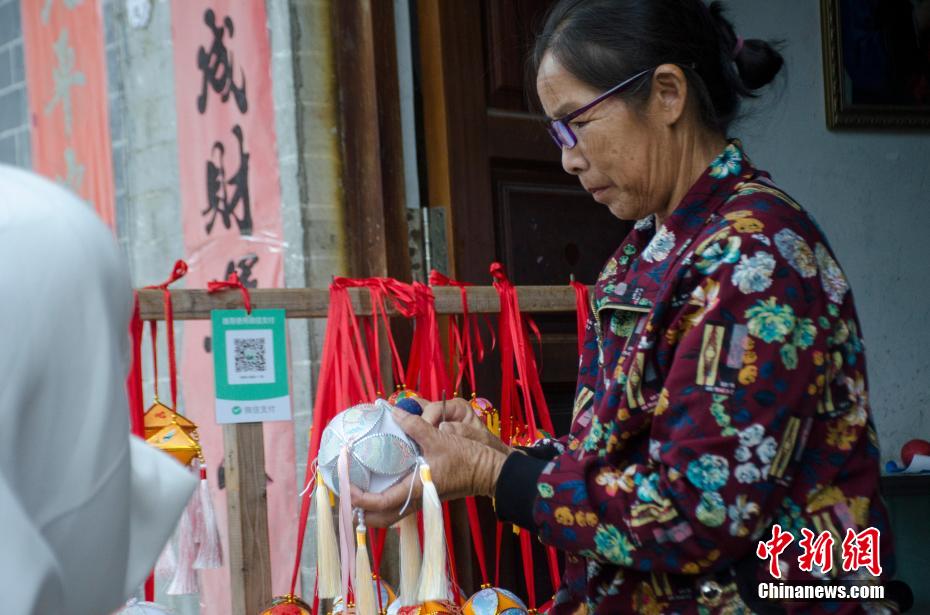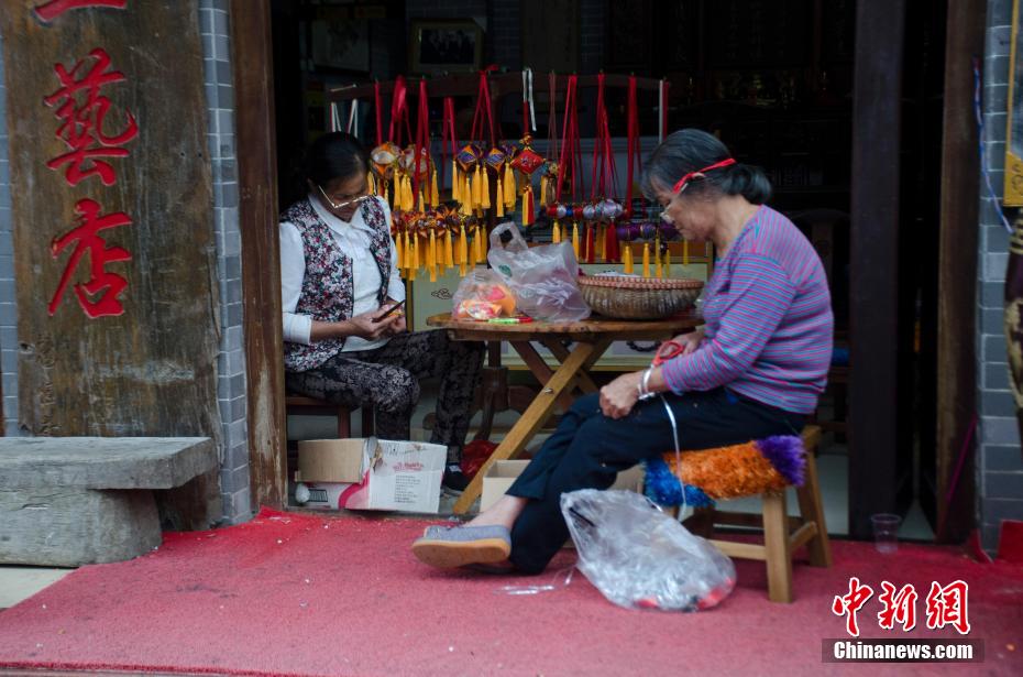 旧州民众在家门口制作绣球。在旧州街上,几乎家家户户都会制作绣球,年产绣球50万个。