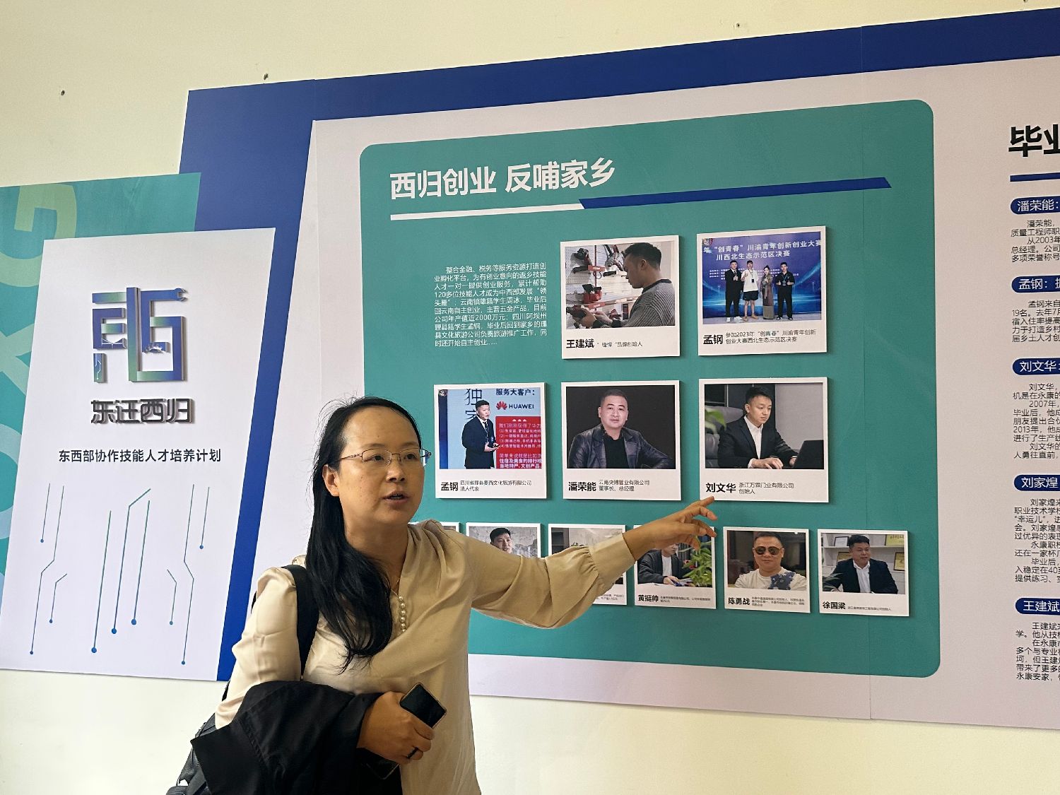 在永康市职业技术学校就读的许多中西部学子毕业后,运用所学知识与技能成功创业,反哺家乡,背后的故事令人动容。图为永康市职业技术学校教师介绍“西归创业 反哺家乡”的企业家代表。(景飞 摄)