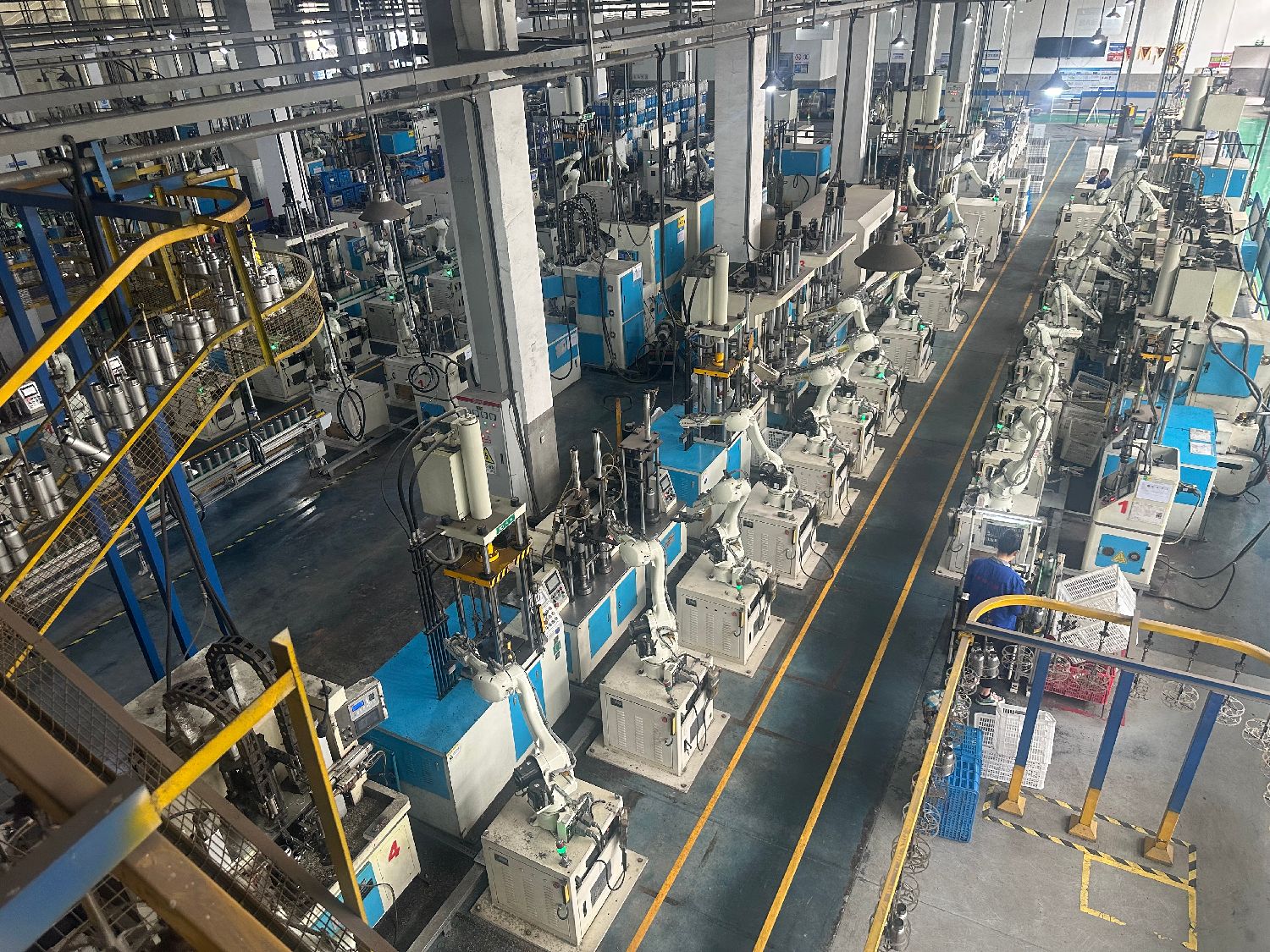 飞剑集团是一家集研发、生产、销售铝制和不锈钢运动水具于一体的专业制造商。 公司连续获得“浙江省成长型中小企业”“浙江省创新型示范中小企业”“浙江五金名品”等荣誉称号。图为飞剑集团5G车间,智能化机械臂有条不紊地生产作业。(景飞 摄)