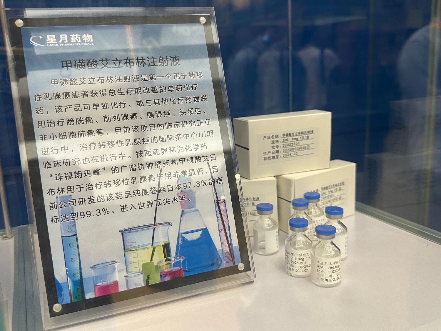 星月药物以高质量的专业人才和科研成果为依托,积极开拓进取,自主研发和对外交流相结合,目前已与多家海内外知名企业展开深入合作。以甲磺酸艾立布林注射液为例,目前,星月药物研发的该药物纯度超越日本97.8%的指标,达到99.3%,进入世界顶尖水平。图为星月集团展示的甲磺酸艾立布林注射液。(景飞 摄)