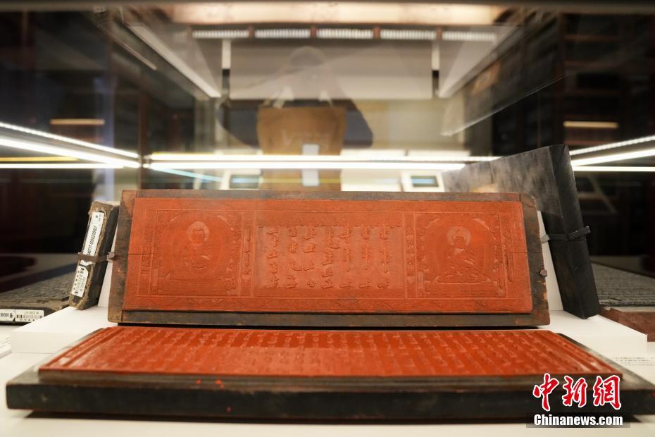 现场展出的《清文翻译全藏经·正法念处经》雕版、《清文翻译全藏经·大般若经》雕版。中新网