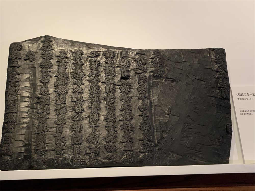展览现场展出的《摄政王多尔衮谕诸王及大臣令旨》雕版。人民网