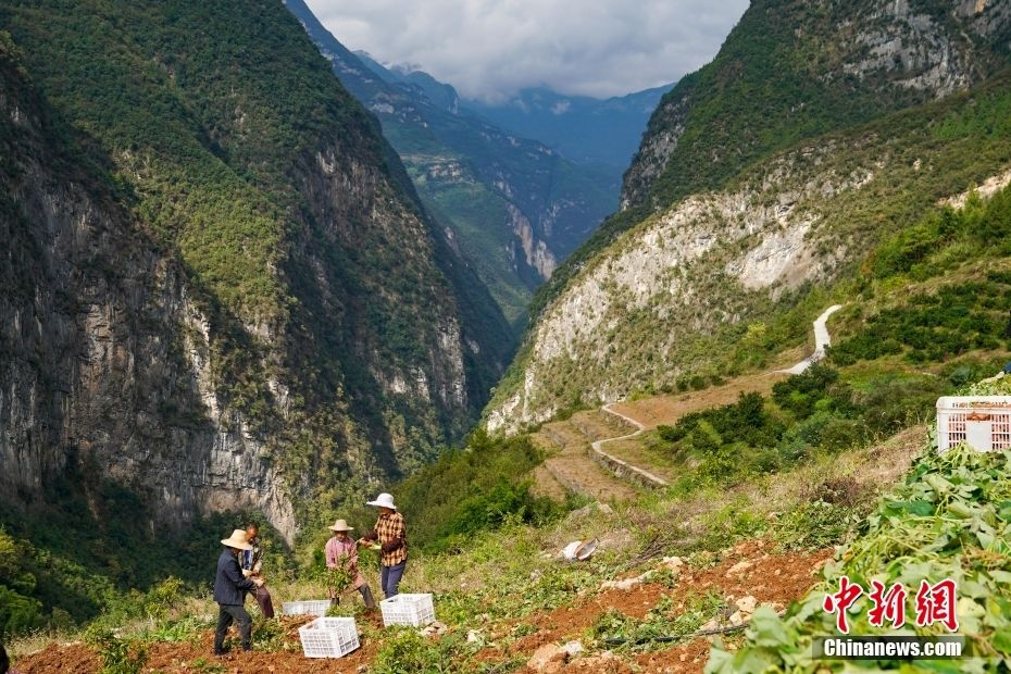 10月28日,下庄村村民在田间劳作,采收红薯。