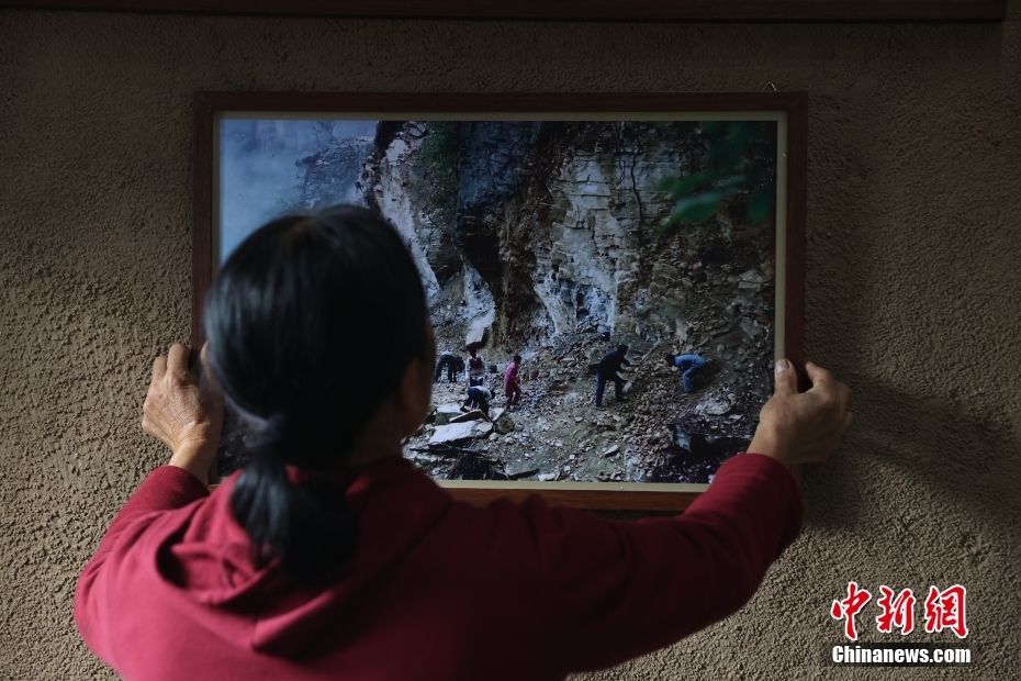 10月28日,参加开凿“天路”的村民陈祖英看着自己曾经修路的照片,感慨今天的幸福生活来之不易。如今陈祖英在下庄村经营着一家农家乐,女儿也返乡创业用扎染讲述下庄故事。