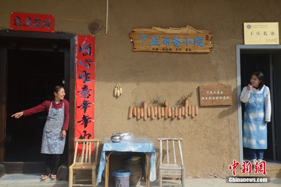 10月28日,下庄村村民陈祖英(左一)站在自己经营的农家乐门前,与在隔壁开起扎染坊返乡创业的女儿袁孝鑫笑谈。