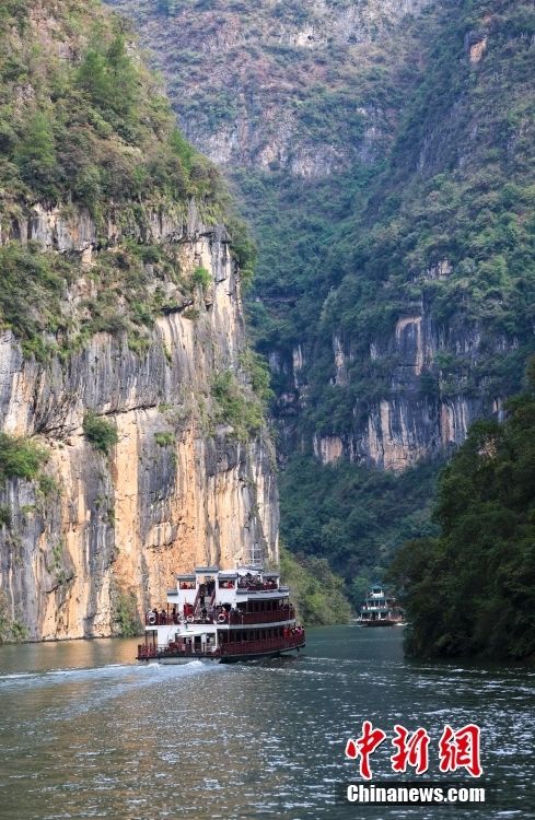 10月28日,民众乘船游览小三峡·小小三峡景区,欣赏两岸秀丽风光。
