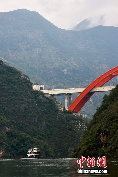 10月28日,一列高铁从郑万高铁巫山大宁河双线大桥上驶过。郑万高铁巫山大宁河双线大桥是中国首座大跨度高速铁路中承式劲性骨架外包钢筋混凝土平行拱桥。