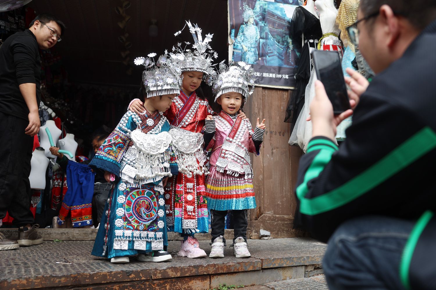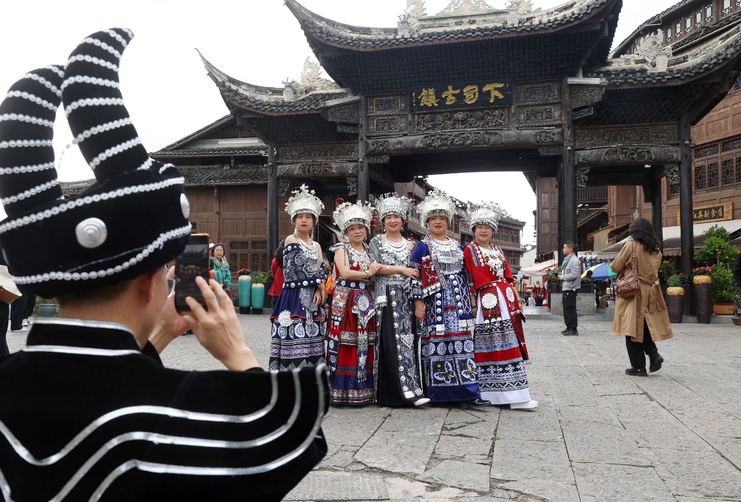 10月28日,游客身穿少数民族服饰在贵州省黔东南下司古镇里合影。 当日,记者走贵州省黔东南苗族侗族自治州,先后参访凯里市下司古镇、台江县红阳苗寨,听村寨的故事,近距离感受贵州古镇与古村的多彩魅力。 李久骏摄