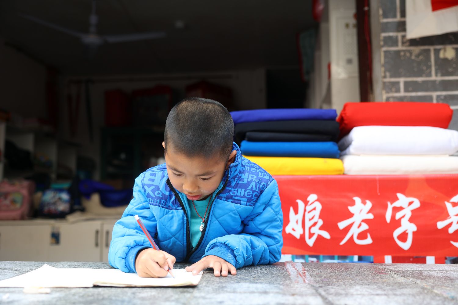 10月28日,下司古镇内一位孩子在自家店铺内写作业。 李久骏摄