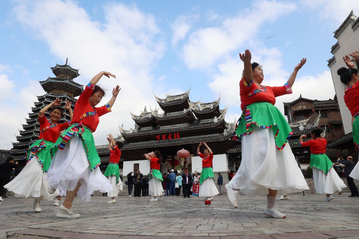 10月28日,居住在下司古镇内的居民正在广场上跳舞锻炼身体。 李久骏摄