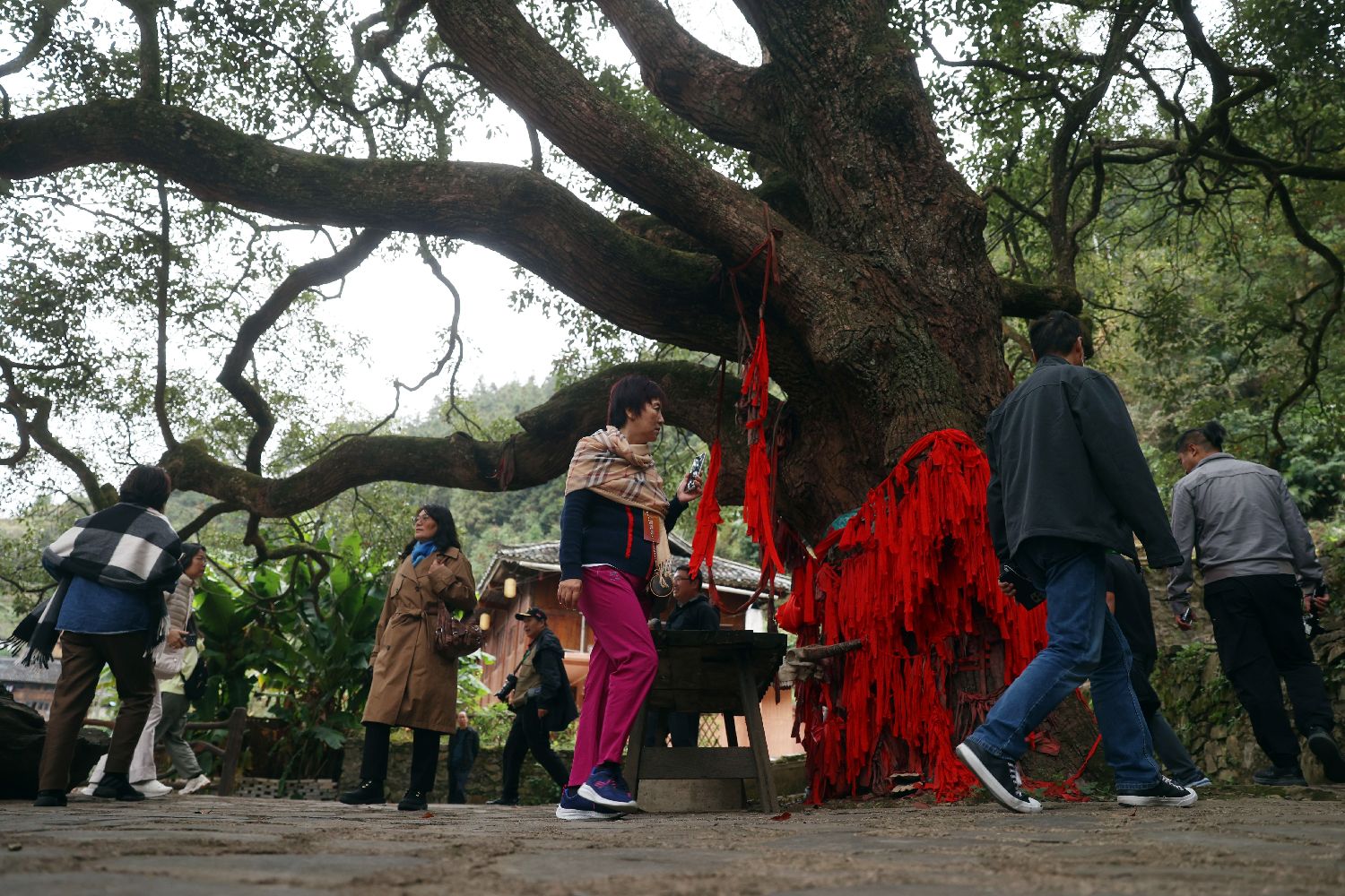 10月28日,游客们绕着红阳苗寨内一颗古树走路以祈福。 李久骏摄
