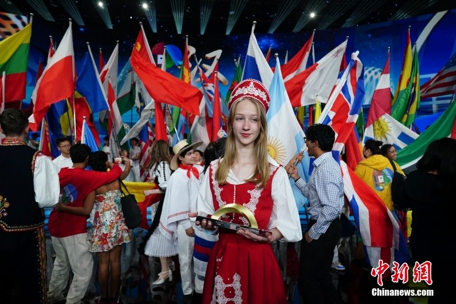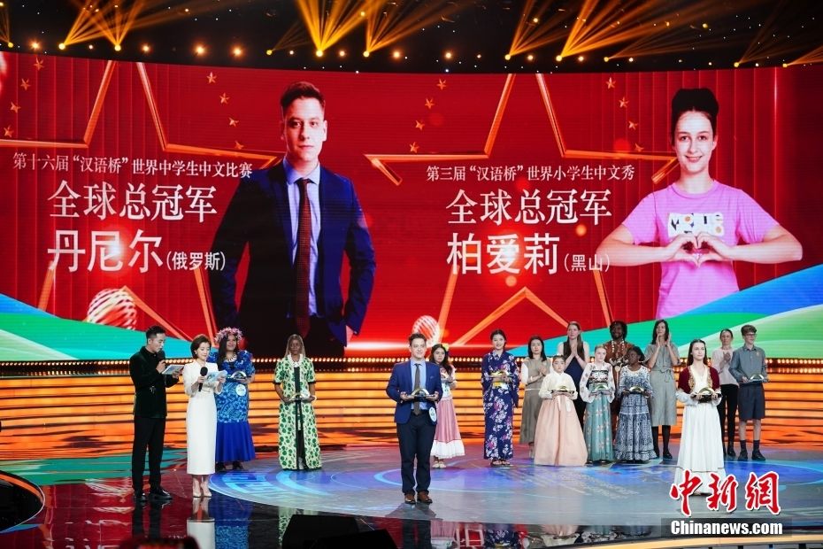 10月30日晚,第十六届“汉语桥”世界中学生中文比赛和第三届“汉语桥”世界小学生中文秀总决赛暨颁奖仪式在昆明举行。图为来自俄罗斯的中学生丹尼尔以及黑山的小学生柏爱莉分别问鼎全球总冠军。中新网