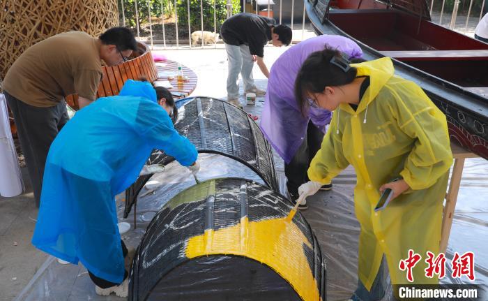 多名青年学子沉浸式彩绘乌篷船。中新网