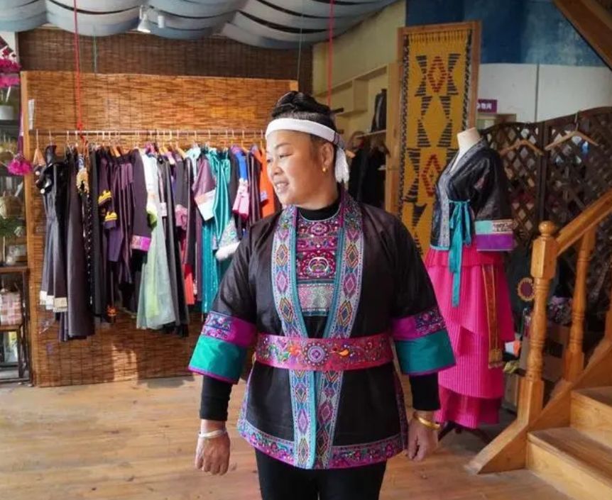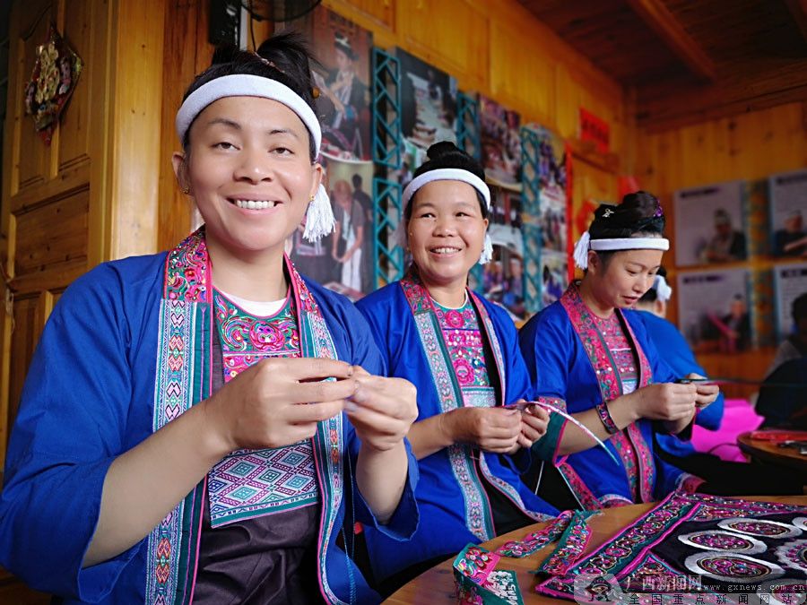 刚脱贫的覃培晓从小对侗绣耳濡目染,因为家婆重病和孩子读书住房不达标2015年被确认为贫困户,家务重,一幅侗绣作品,没有几年都完不成。2018年危房改造搬迁后,覃培晓脱贫了,她加入杨甜的团队,平时在家照顾老人,一有空就和大家一起参加刺绣一年也有5000多元的收入补贴家用。图为覃培晓脱贫了,她加入杨甜的团队。广西新闻网
