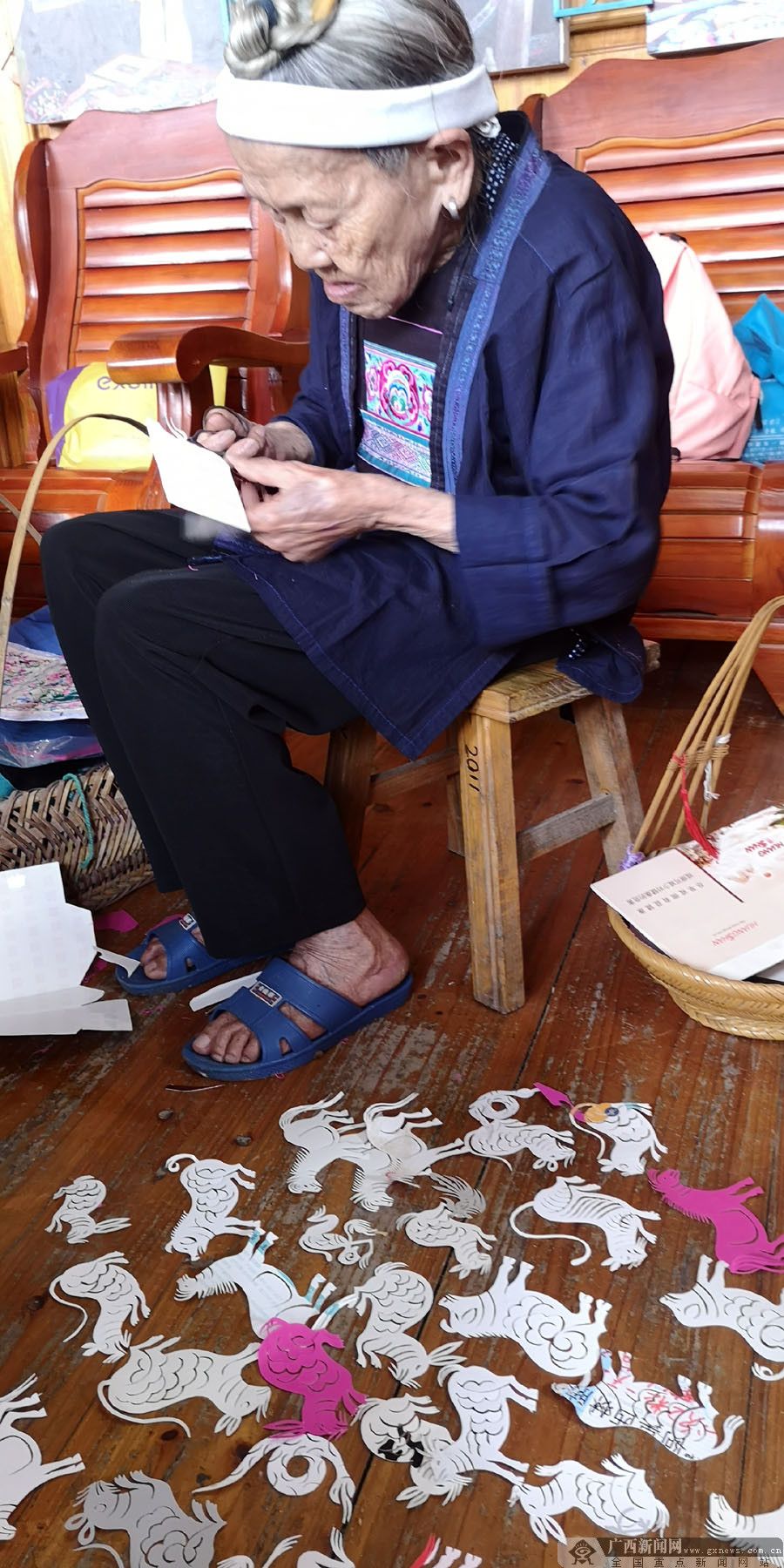 清花绣坊采用“企业+基地+传承人+绣娘”的模式,带动当地留守妇女居家灵活就业。90多岁的老人覃奶时清也和大家一起刺绣,尽管她听不懂普通话,但她可以用侗话与人沟通。她剪纸手艺,不用描,随手剪出来的12生肖惟妙惟肖。图为覃奶时清剪纸手艺。广西新闻网