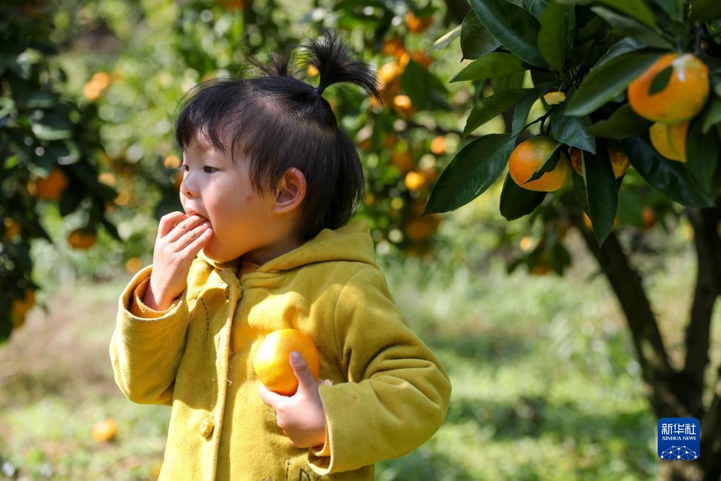 金秋时节,中国各地水果飘香,人们在果园忙碌,分享收获的喜悦。图为11月1日,一名小朋友在贵州省开阳县南龙乡土香村柑橘种植基地品尝柑橘。新华社