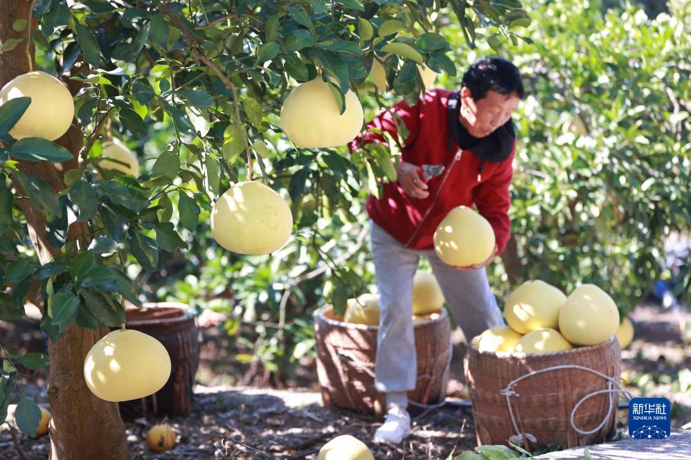 11月1日,村民在贵州省岑巩县注溪镇周坪村思州柚种植基地采收柚子。新华社