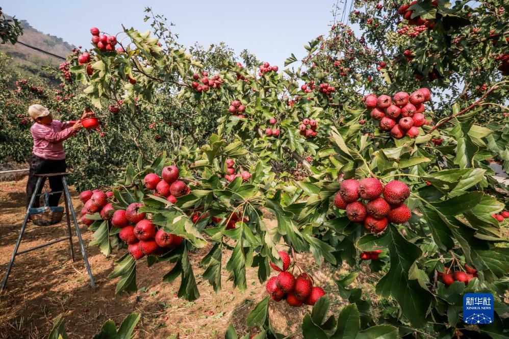 10月30日,河北省遵化市地北头镇鲁家峪村农民在果园采摘山楂。新华社