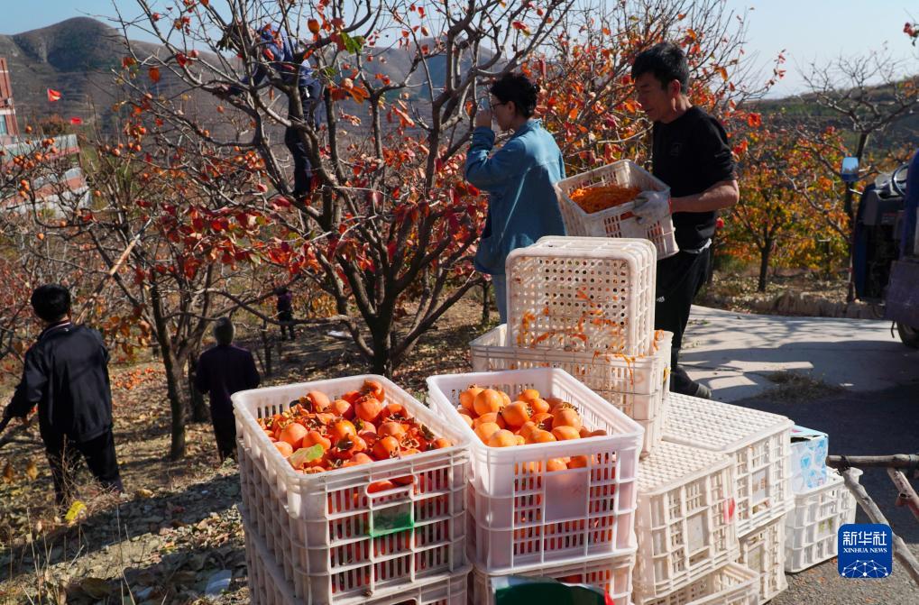 11月1日,在山东省潍坊市临朐县五井镇,村民在采摘柿子。新华社
