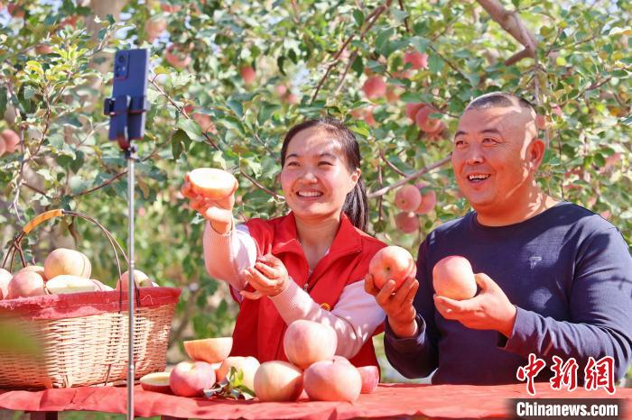 近日,在新疆维吾尔自治区阿克苏地区库车市比西巴格乡的果园,种植户通过直播的方式销售苹果。中新网