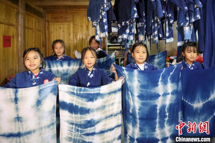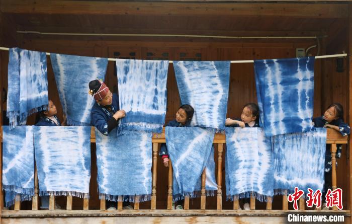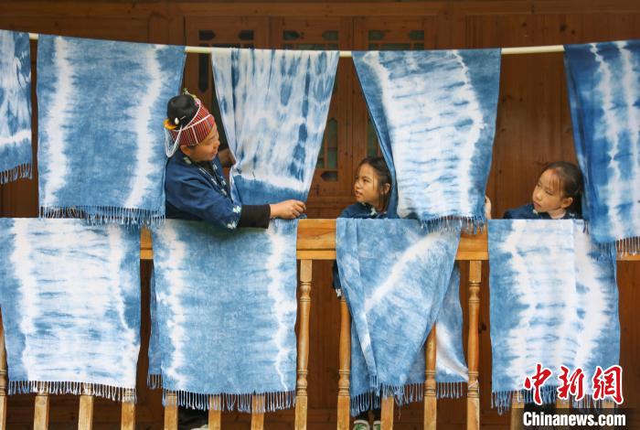 长期以来,黄古小学把民族文化充分结合到兴趣教学和学习生活中,学生们通过自制蓝靛染民族校服,组织围巾义卖,收获民族技艺和创作价值,让施秉这座最偏远的村级小学校园文化充满民族特色。图为黄古小学内,非遗传承人万秀英在指导学生晾晒扎染。中新网
