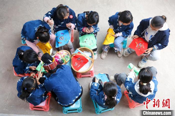 非遗传承人万秀英在施秉县马号镇黄古小学内指导学生学习苗族刺绣。中新网