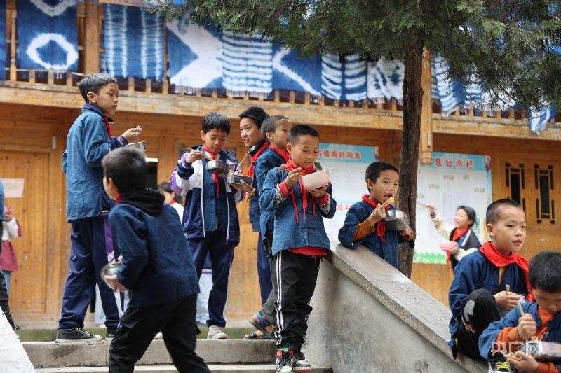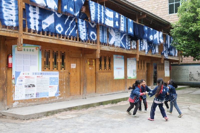 在黄古小学,植物提取的蓝色广泛运用在学生自制的校服和围巾中。图为学生们身着自己参与制作的校服。央广网/施秉县融媒体中心供图