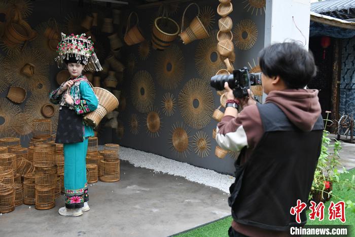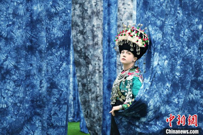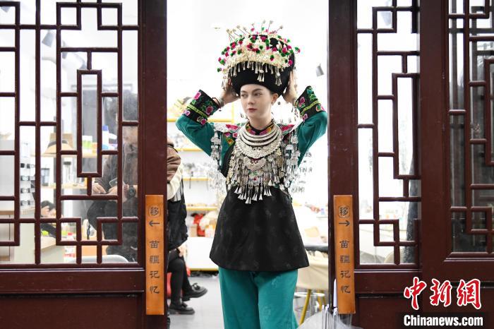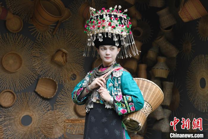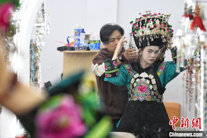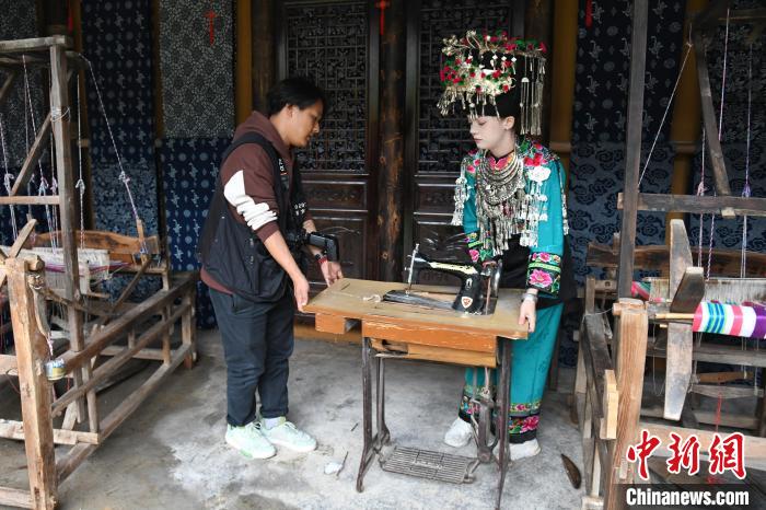 廖文辉为塔季娅娜拍摄苗族服饰照片。
