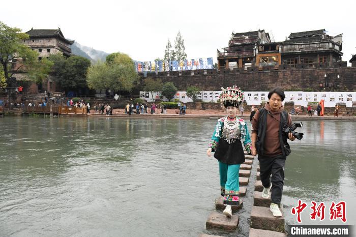 “我们要将凤凰古城的美景和文化推荐给更多俄罗斯朋友。”塔季娅娜和廖文辉想要以摄影为桥,促进中俄两国文化交流。图为塔季娅娜拍摄苗族服饰照片。