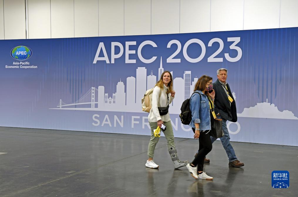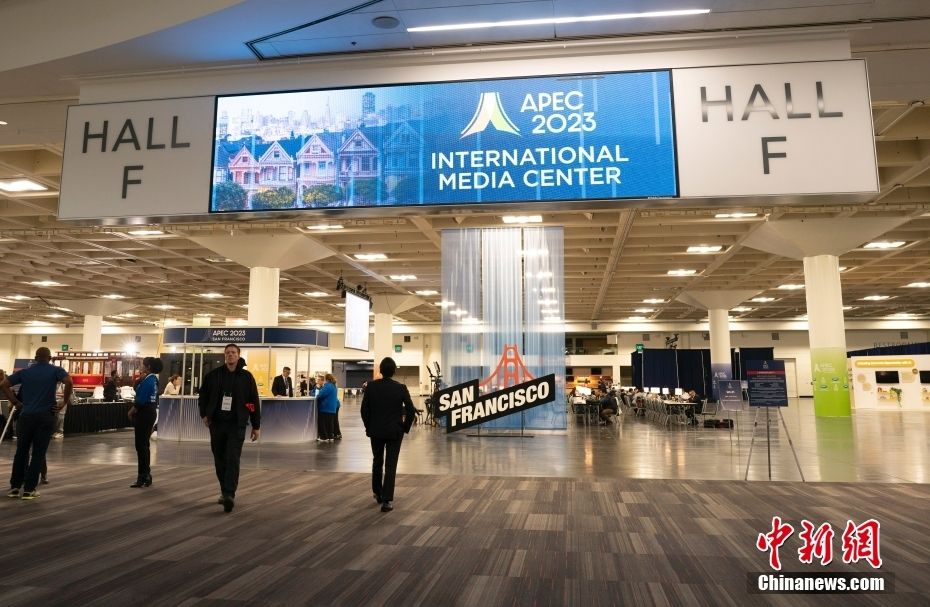 2023年亚太经合组织(APEC)会议近日在美国加州旧金山开幕,日前,大会国际媒体中心已向注册记者开放。同时,旧金山已经对街头公共设施展开清理和维护,迎接会议召开。图为当地时间11月12日,记者经过2023年亚太经合组织会议国际媒体中心内的一幅海报。新华社