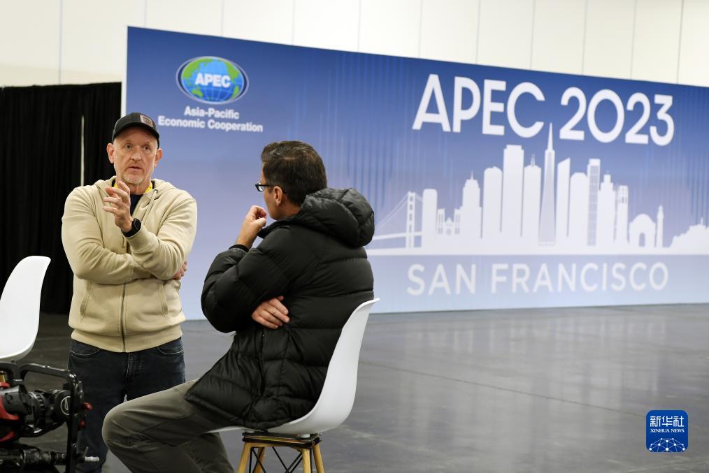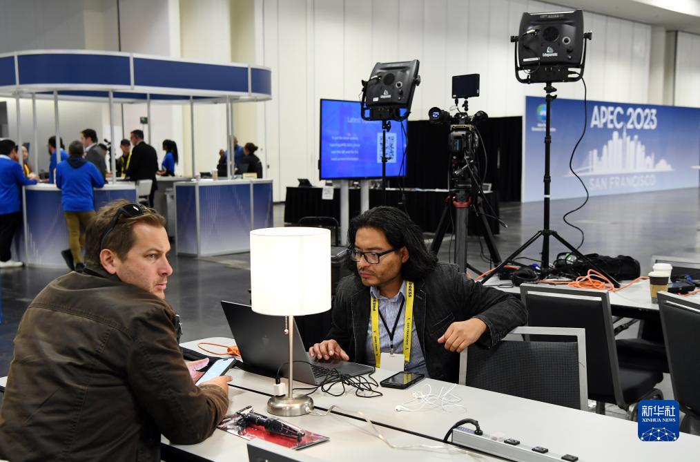 记者在美国旧金山的2023年亚太经合组织会议国际媒体中心内交谈。新华社