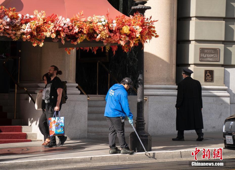 11月13日,一名清洁工在美国加州旧金山联合广场周边捡拾垃圾。中新网