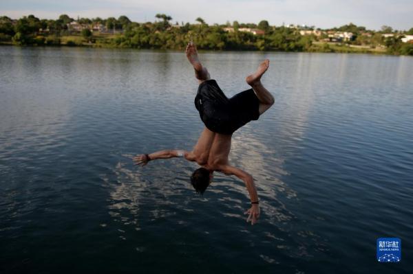 11月14日,在巴西首都巴西利亚,一名男子跳入帕拉诺阿湖消暑。