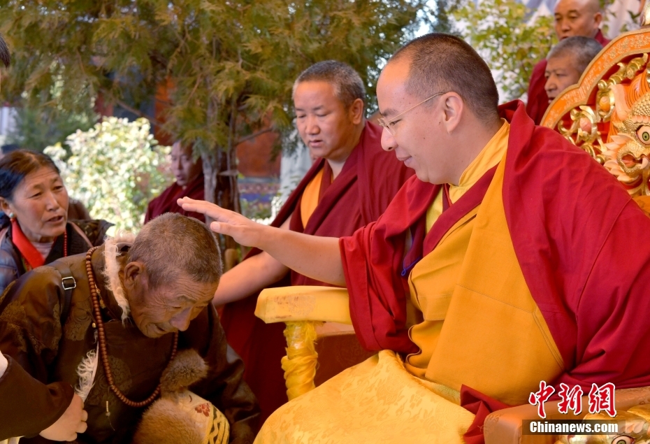 11月13日、14日,中国佛教协会副会长、中国佛教协会西藏分会会长班禅额尔德尼·确吉杰布在日喀则扎什伦布寺为数万名信教群众摸顶赐福。图为11月13日,班禅为信众摸顶赐福。