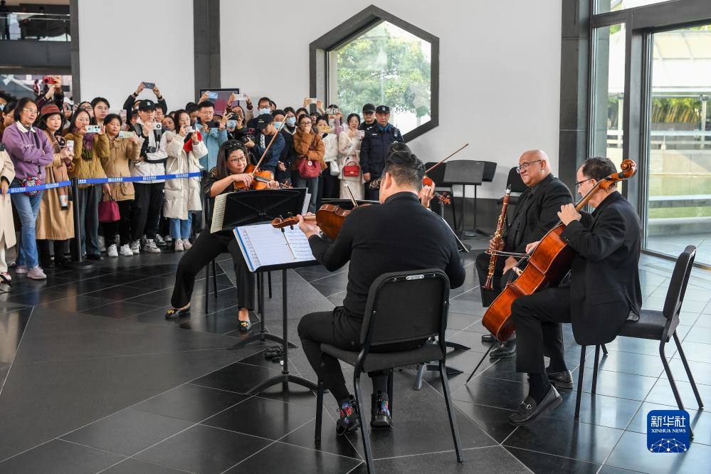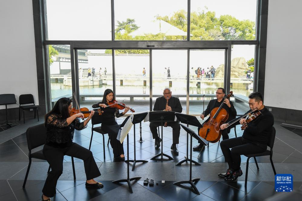 11月16日,费城交响乐团的演奏家们在苏州博物馆大厅内演奏。当日,来自费城交响乐团的演奏家们来到苏州拙政园和苏州博物馆进行演出,为这里的观众们带来精彩的视听盛宴。新华社