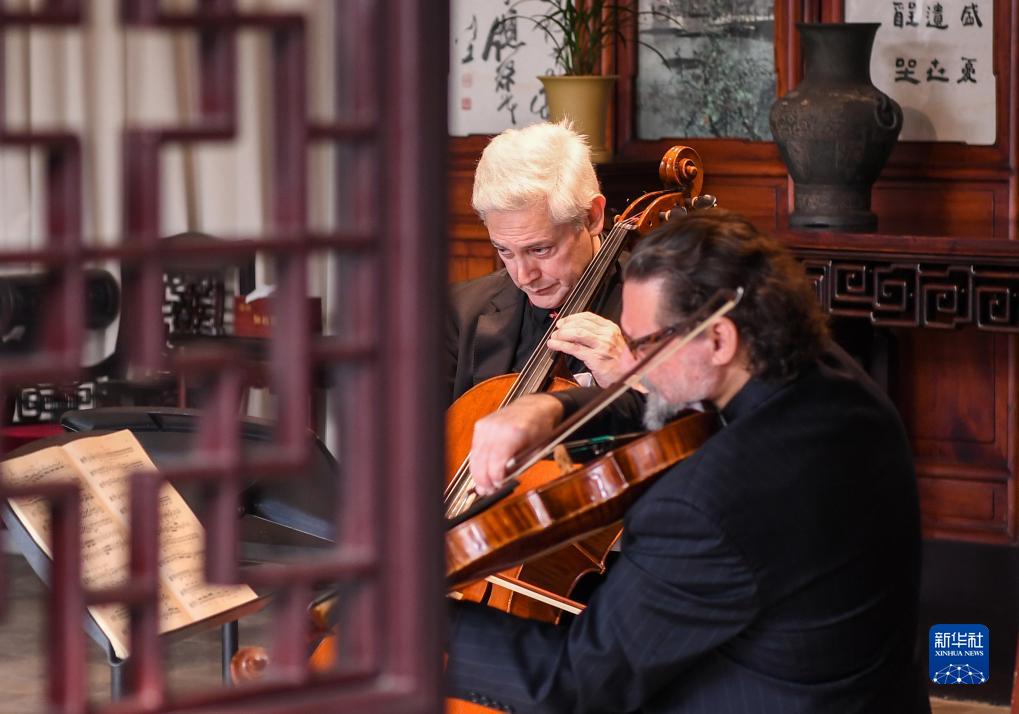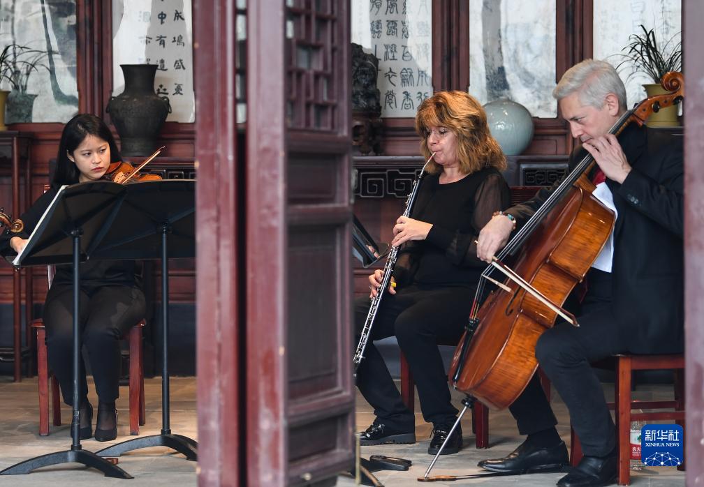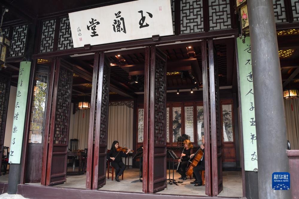 11月16日,来自费城交响乐团的演奏家们在苏州拙政园玉兰堂演奏。新华社