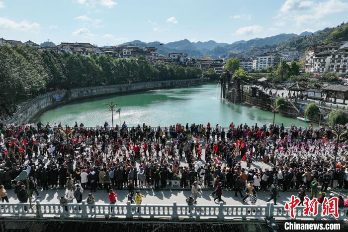 11月16日,身着盛装的苗族民众在雷山县县城载歌载舞欢庆苗年和鼓藏节。新华社