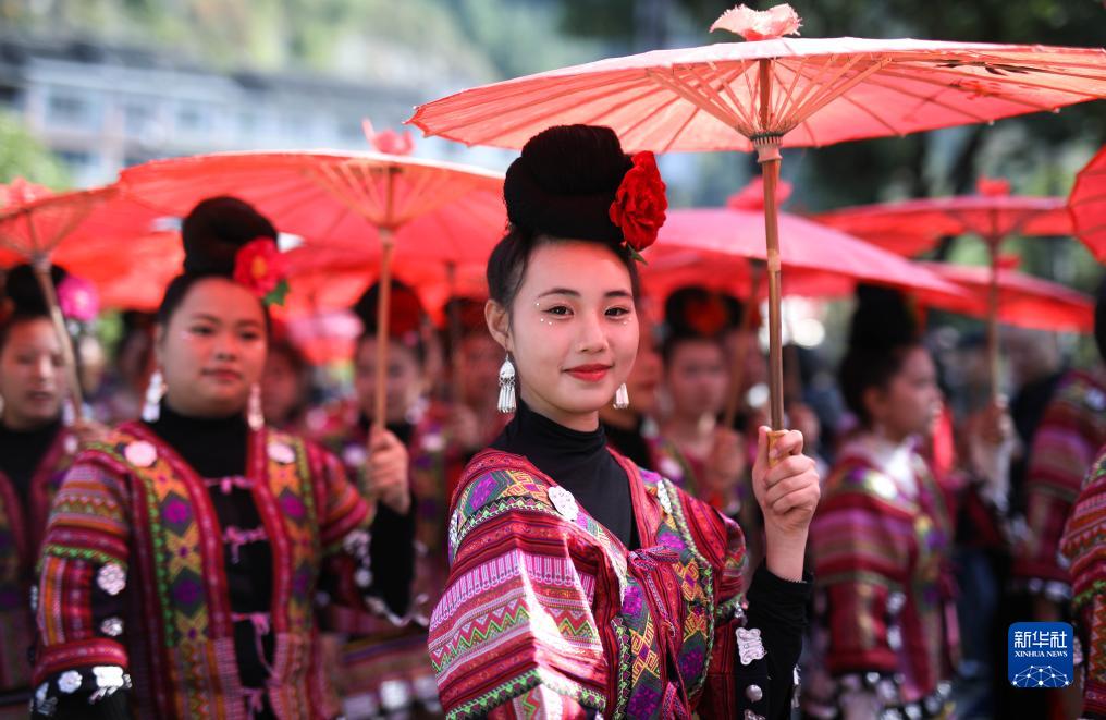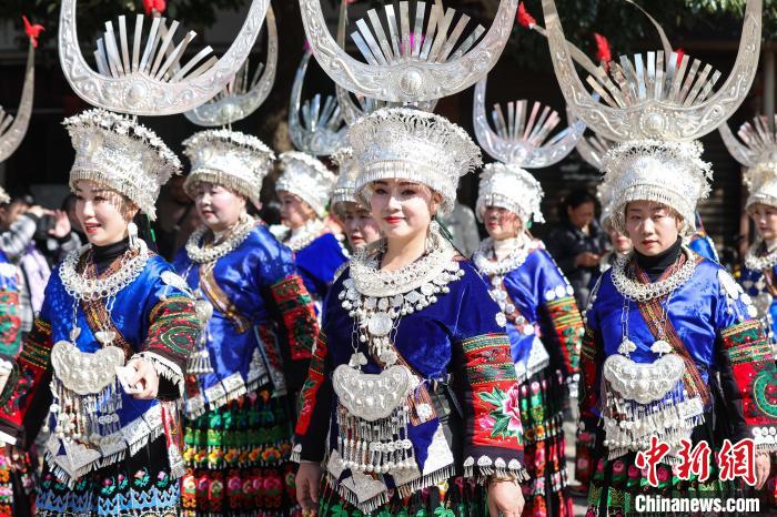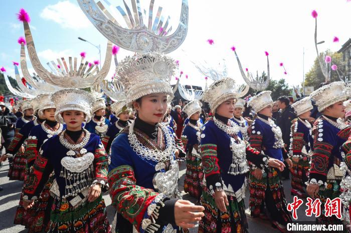 11月16日,身着节日盛装的苗族民众参加雷山县苗年盛装巡游活动。新华社