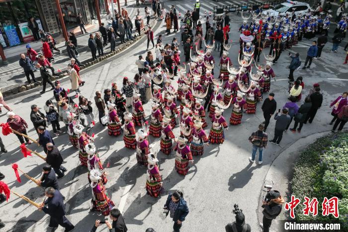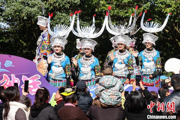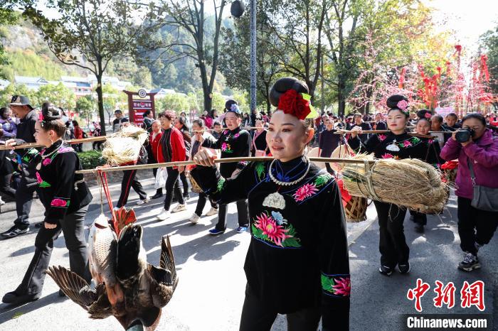 苗族民众挑着节日的礼物参加非遗大巡游。中新网