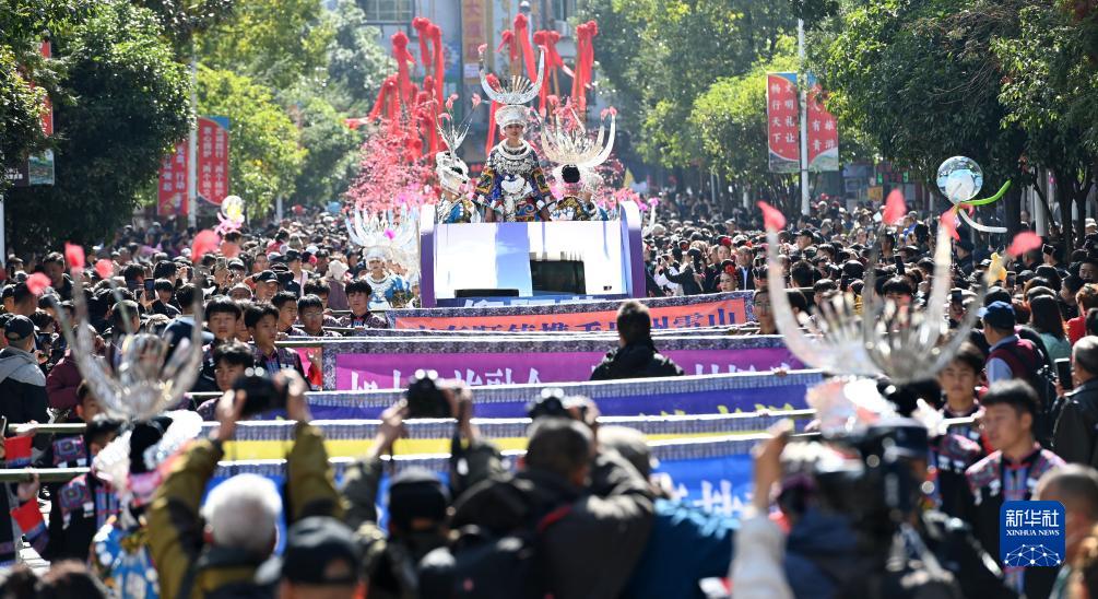11月16日,在雷山县县城,苗族民众身着盛装,载歌载舞参加苗年和鼓藏节的巡游活动。新华社