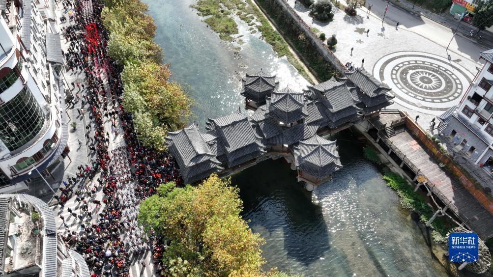 11月16日,在雷山县县城,苗族民众身着盛装,载歌载舞参加苗年和鼓藏节的巡游活动(无人机照片)。新华社