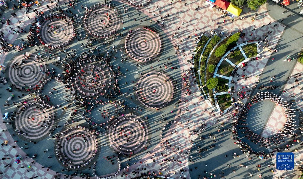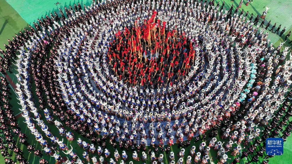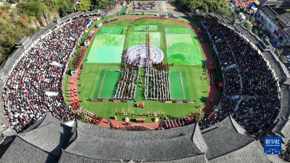 11月16日,在雷山县民族文化活动中心,苗族同胞身着盛装,载歌载舞欢庆苗年和鼓藏节(无人机照片)。新华社
