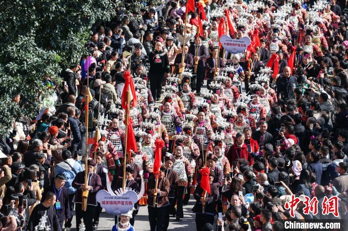 苗族民众穿着节日盛装、吹奏芦笙参加巡游。中新网
