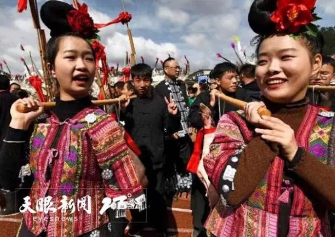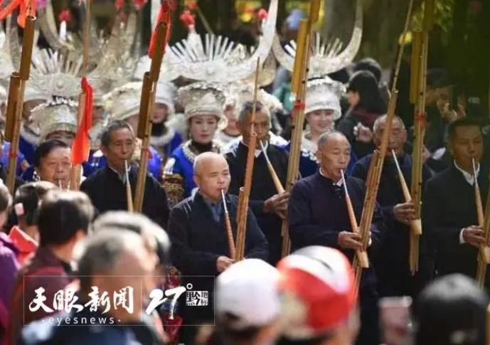 苗族民众穿着节日盛装、吹奏芦笙参加巡游。天眼新闻