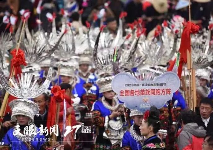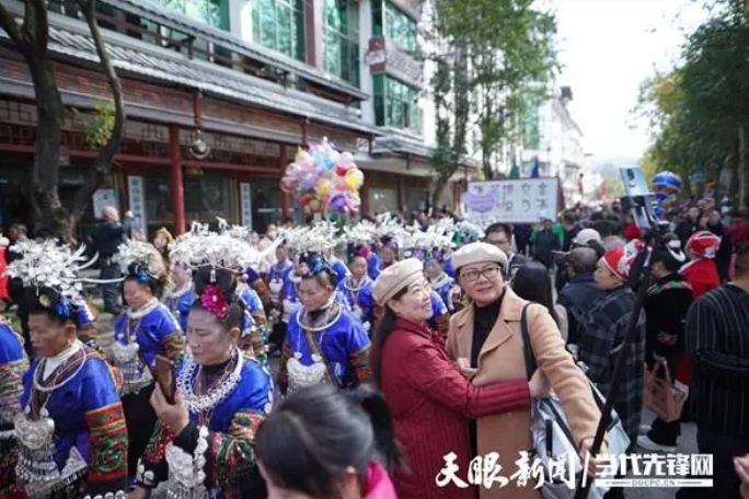 11月16日,雷山苗年暨鼓藏节非遗巡游展示在县城精彩上演,少数民族同胞们身着民族服饰载歌载舞,向游客展现着独特的非遗文化。天眼新闻