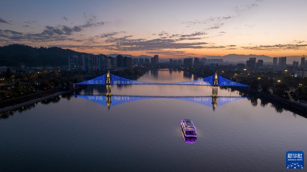 11月20日,安徽省黄山市屯溪区新安江观光索桥为世界儿童日亮灯(无人机照片)。新华社